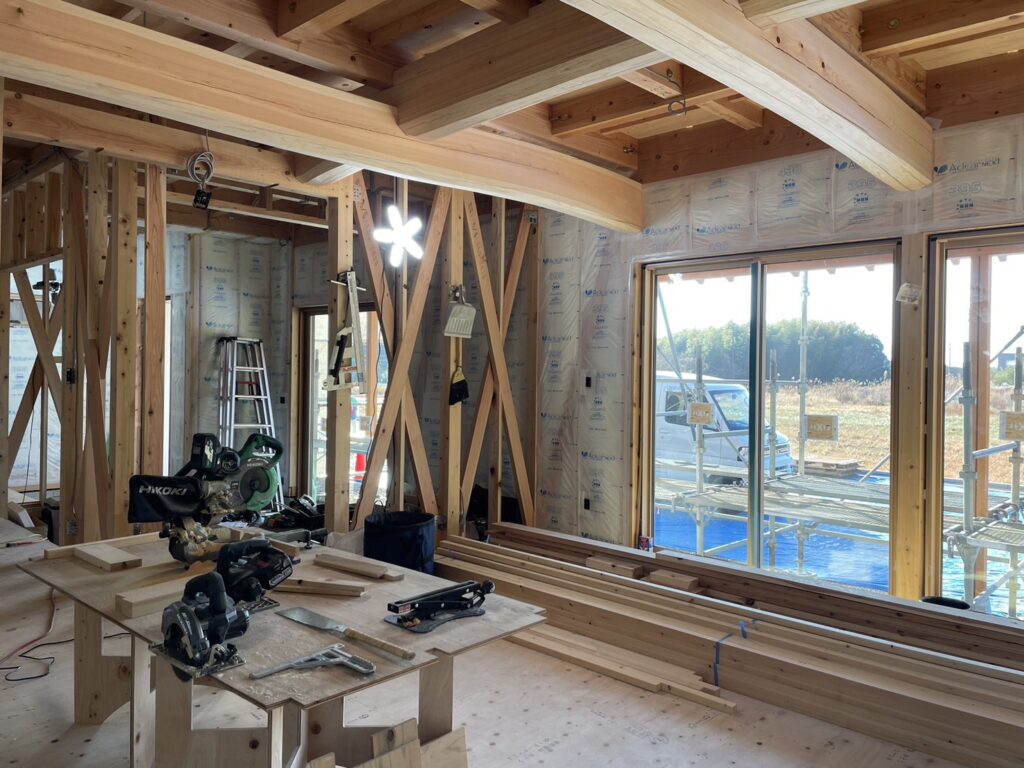 1、2階の壁断熱材を施工しました。今回は高性能グラスウール断熱材アクリアネクスト14K85㎜厚を使用しました。天井には155㎜厚を使用します。サッシもLIXILの高性能断熱窓「TW」を使用していますので、この冬の寒い日でも家の中は暖かく夏は涼しく快適に暮らせます。