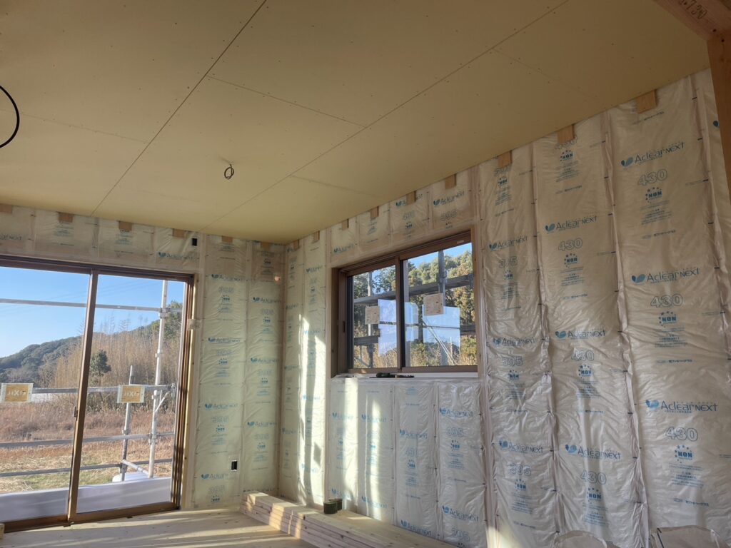 一階リビングの天井には桧の無垢板を使用しました。桧の化粧野物梁と合いますね。きれいに仕上がりました。現場の中は桧のいい匂いがします。