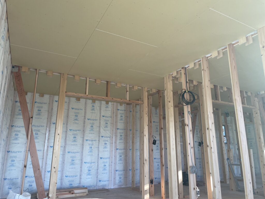 天井の施工です。クロス仕上げの天井はプラスターボードで下地を作ります。ボードを貼りクロス屋さんがパテ埋め作業をしてクロスを貼っていきます。クロス屋さんの出番はまだまだ先です。