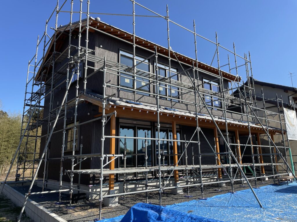 外壁工事が完了しました。今回は窯業系サイディングを使用。ケイミューの和ボーダー15を縦張りで仕上げました。落ち着いたおしゃれ和風になりました。もう少しで足場が取れます。足場が取れるとガラッと雰囲気が変わるので楽しみです。