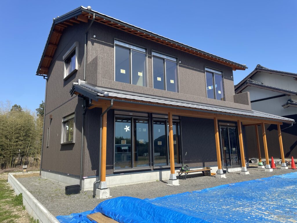 足場が取れてだいぶ感じが変わりました。だんだんと完成に近づいていきます。これから水道工事、タイル工事、ベランダ手摺など進めていきます。
