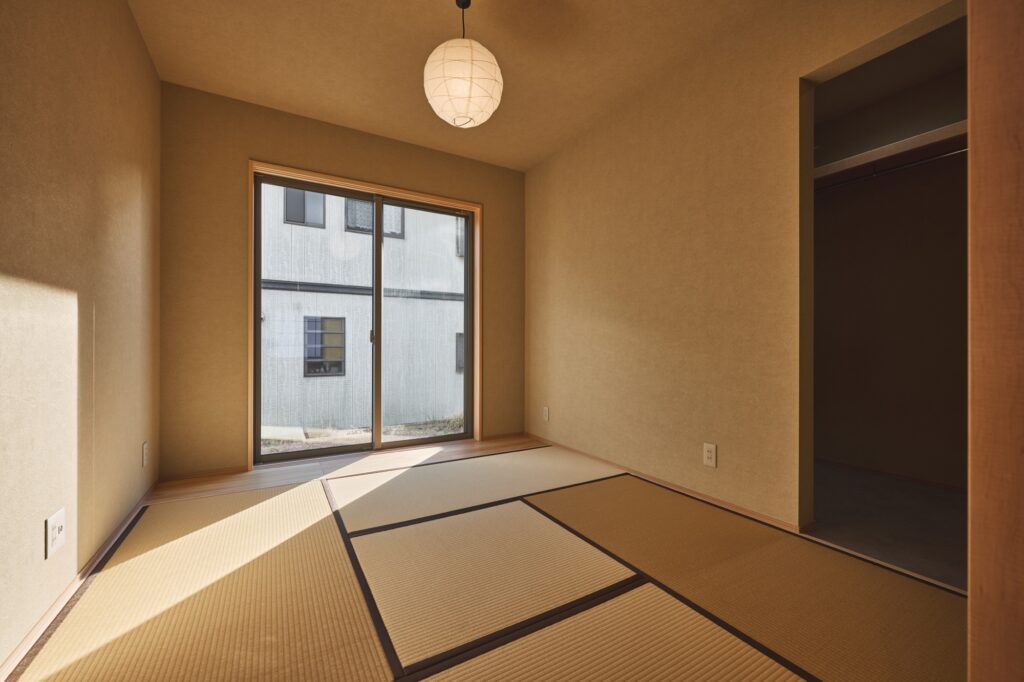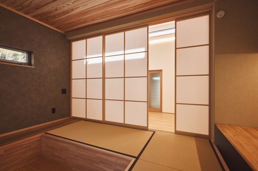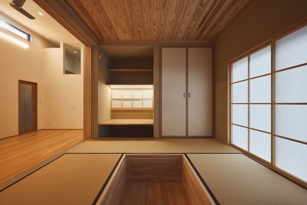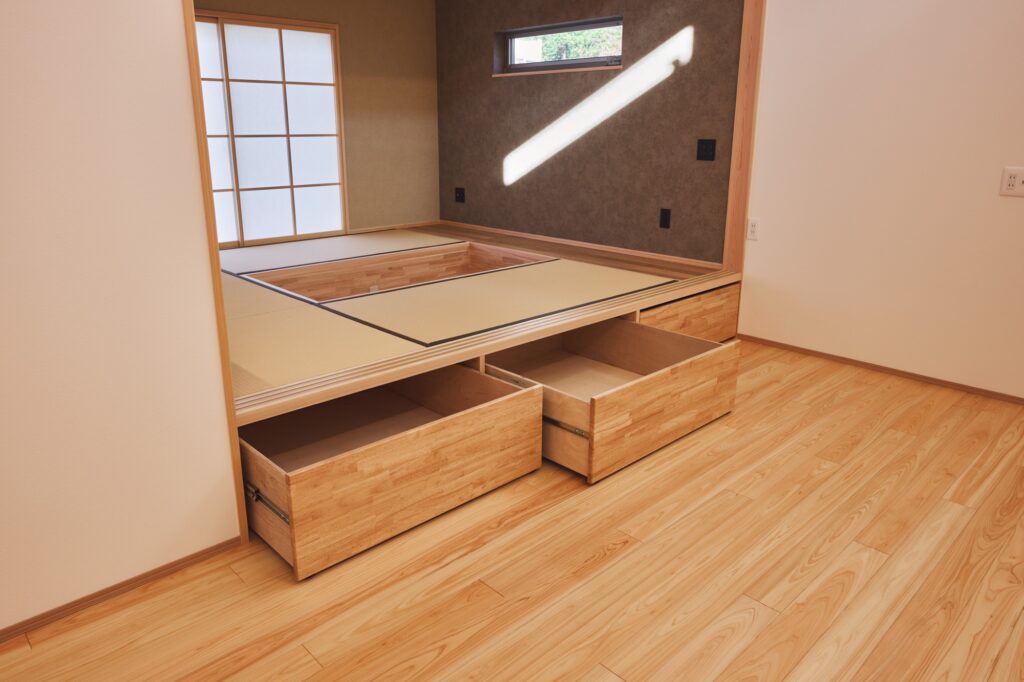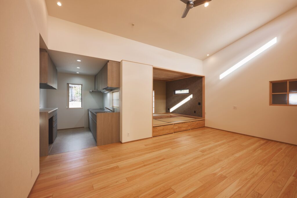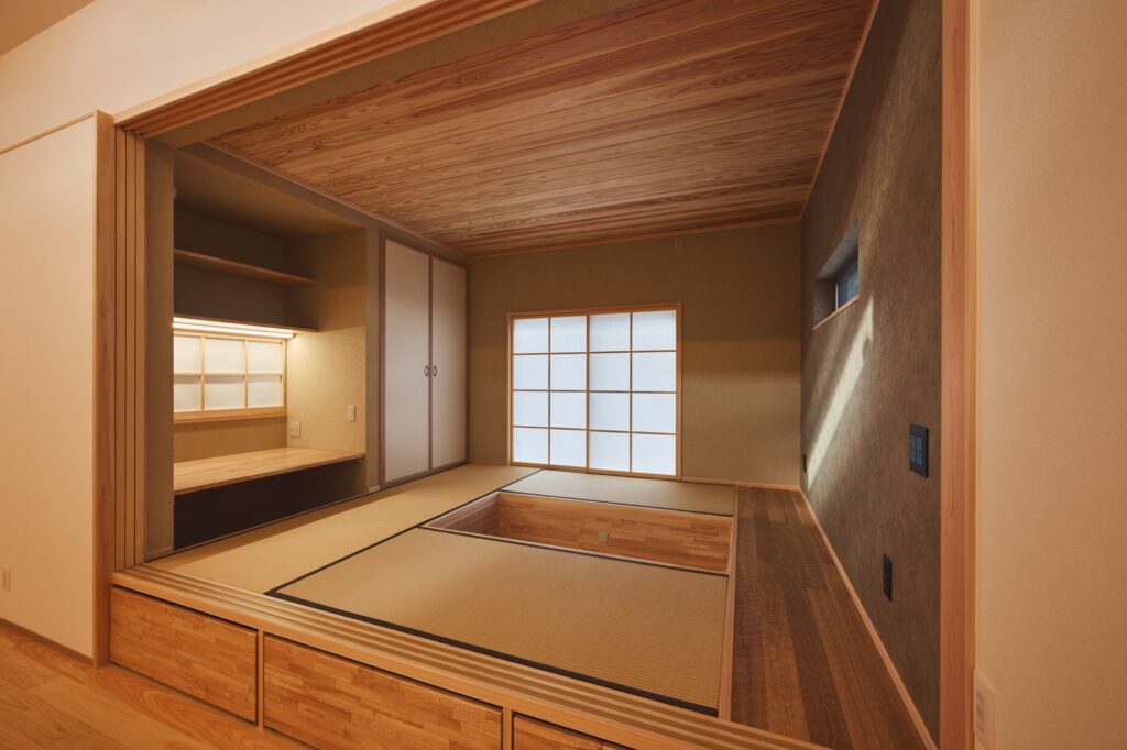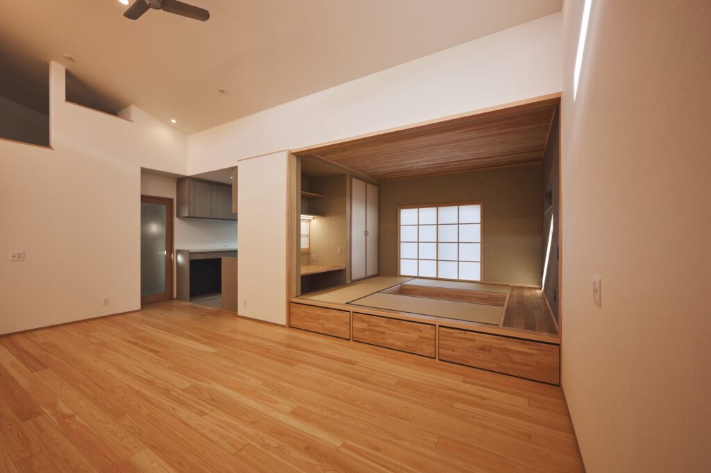 リビングは吹抜けになっていて、小上がりになった和室があります。引戸を閉めればひとつの部屋としても使えます。小上がりにして引出し収納、掘りごたつを設置。キッチンからも覗けるように引込み戸を設けてお子さんの勉強や遊びの様子を見ながら家事などをできます。