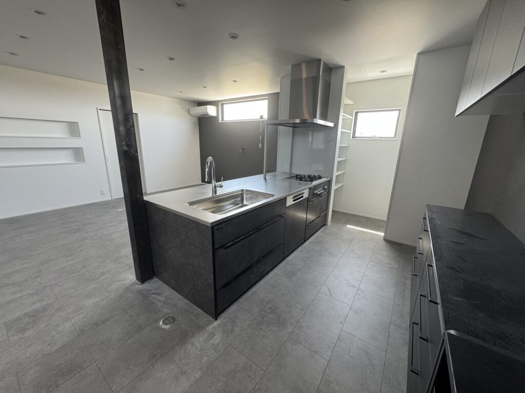 2階の住居は22帖の広々としたリビングに白とグレーを基調として、おしゃれな感じになりました。キッチンもアイランドキッチンで大きい天板のカウンターなので作業もゆったりとできます。